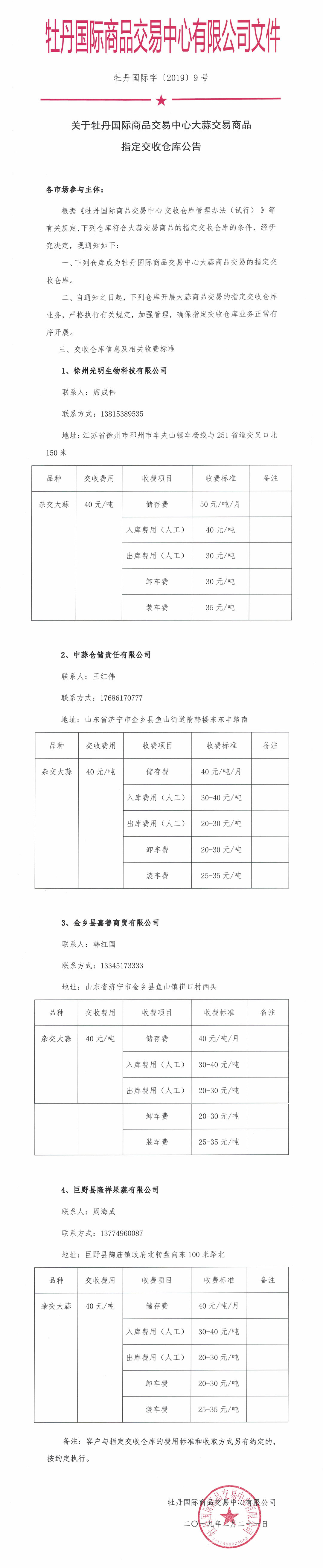 關(guān)于牡丹國(guó)際商品交易中心大蒜交易商品指定交收倉(cāng)庫(kù)公告