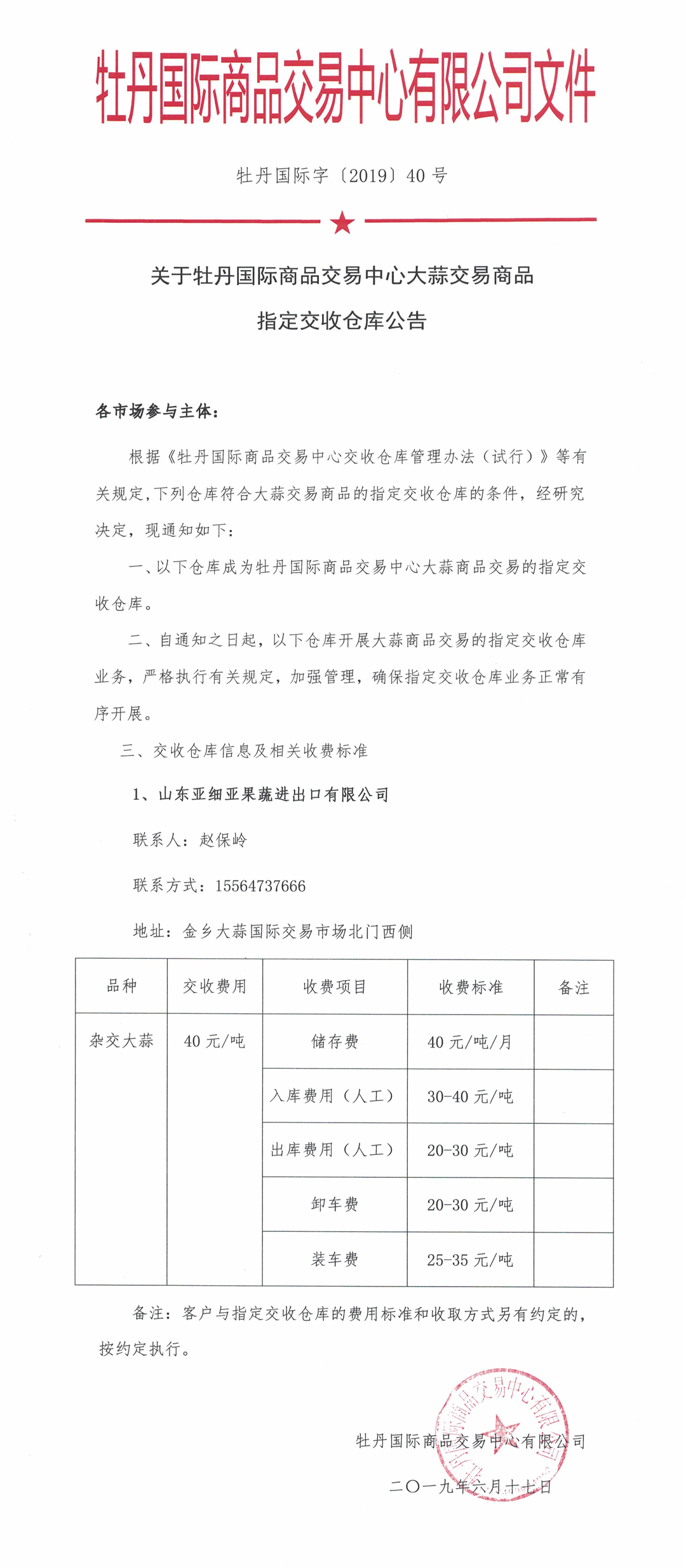關(guān)于牡丹國際商品交易中心大蒜交易商品指定交收倉庫公告