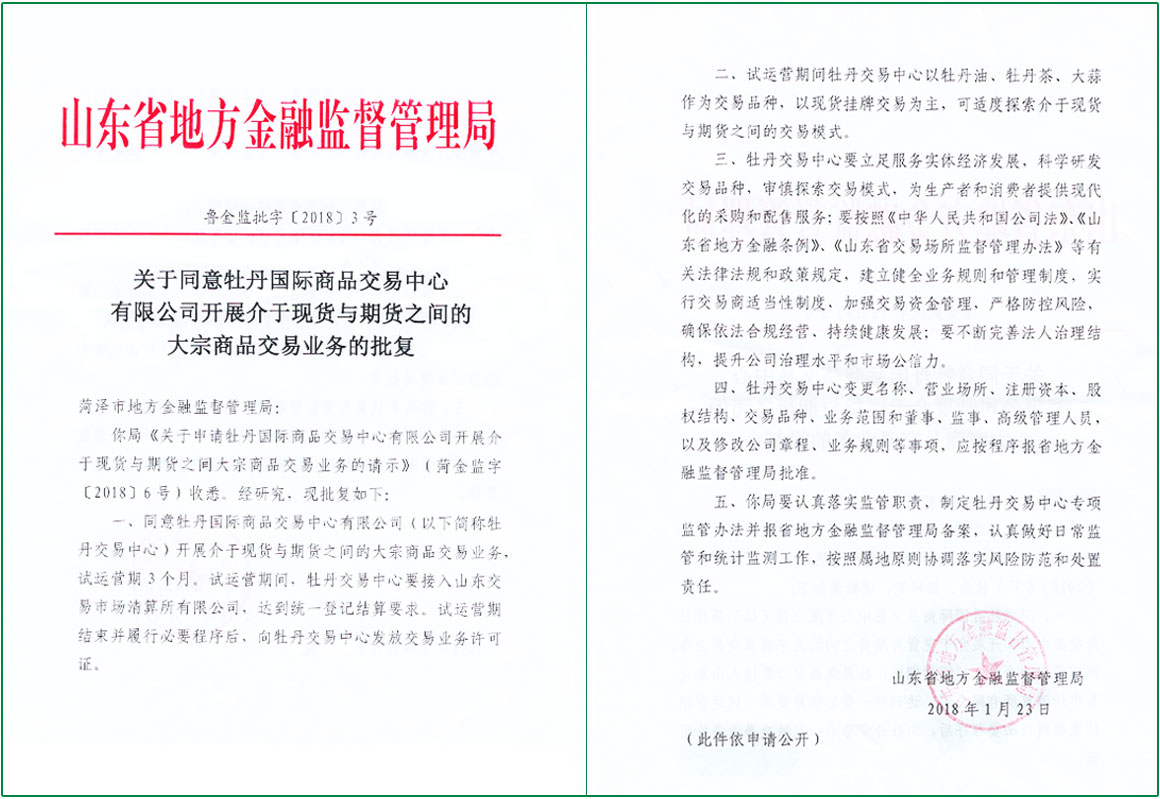 1、《關(guān)于同意牡丹國(guó)際商品交易中心有限公司開展介于現(xiàn)貨與期貨之間的大宗商品交易業(yè)務(wù)的批復(fù)》